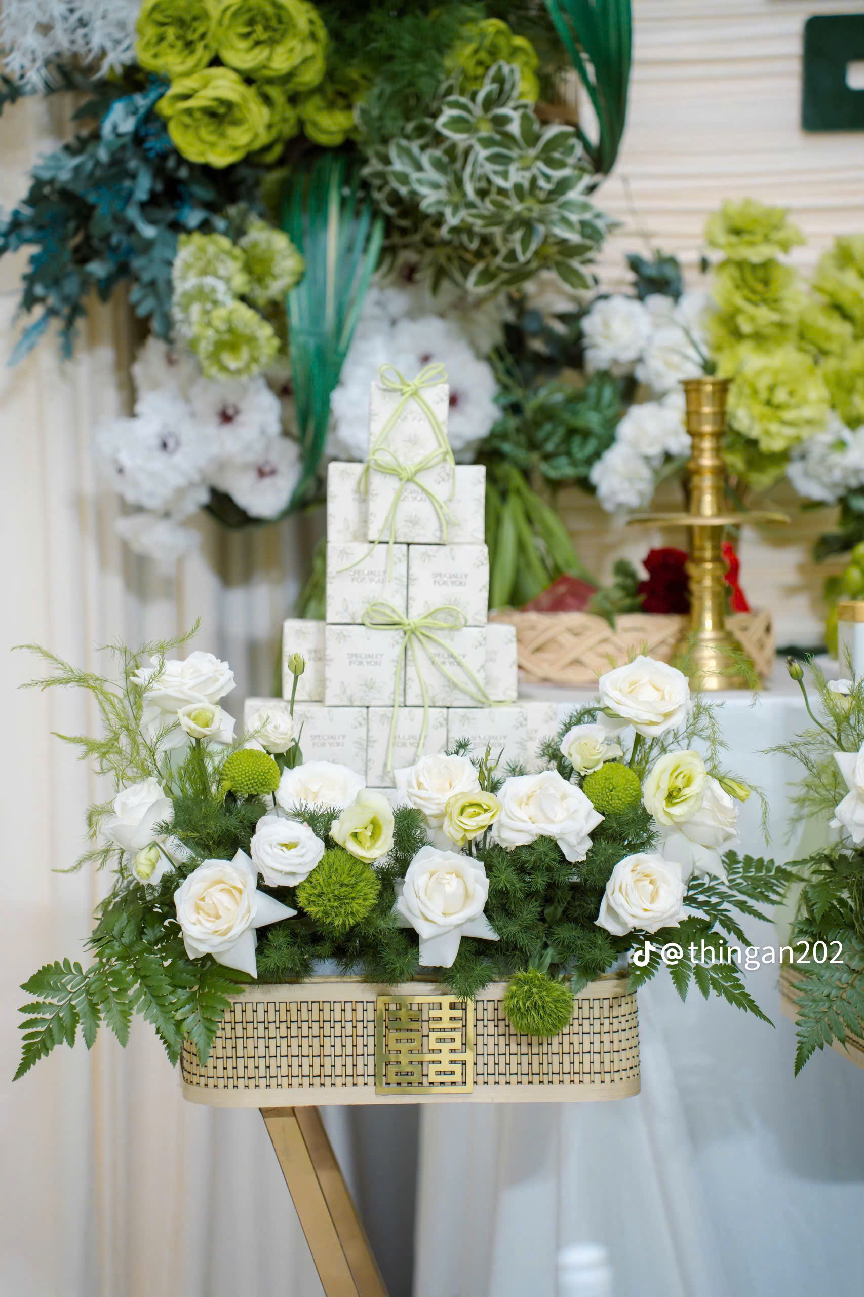 - Mâm bánh phu thê (60 cáii) xếp hộp hiện đại kết hoa tươi